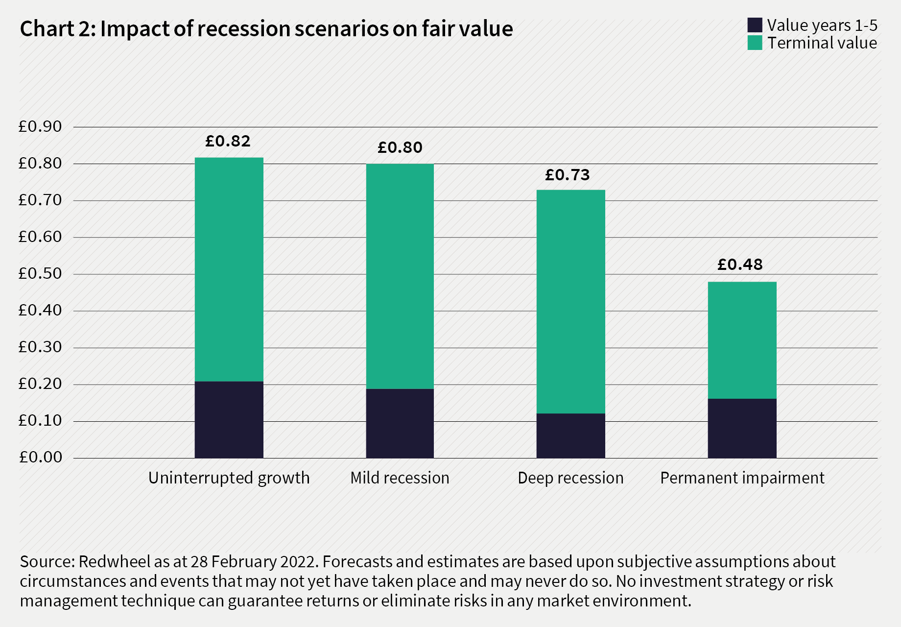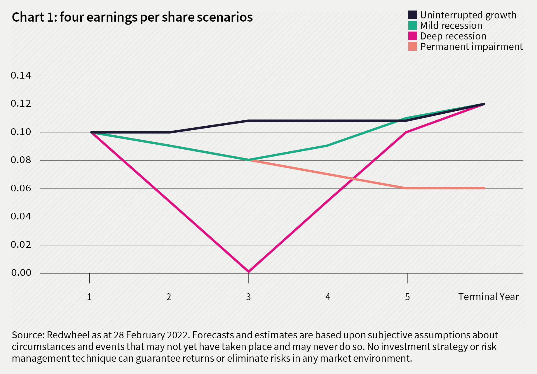 Even in a severe recession scenario, where profits are sharply reduced for a period, the impact on intrinsic value is limited. It is only when earnings suffer permanent impairment, and fail to recover to prior levels, that long-term value is significantly affected.